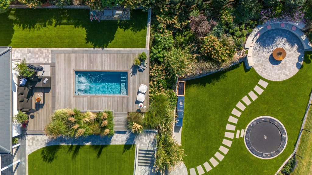 Just a stone’s throw from the Baltic Sea coast lies this property, designed by Gartenprofi Wuttig Landschaftsbau with an exclusive mini pool. The spacious garden landscape also includes an in-ground trampoline and a stylish grill and fireplace area with a barbecue barrel. According to the homeowners’ wishes, the wooden deck surrounding the pool is framed by richly planted garden beds.