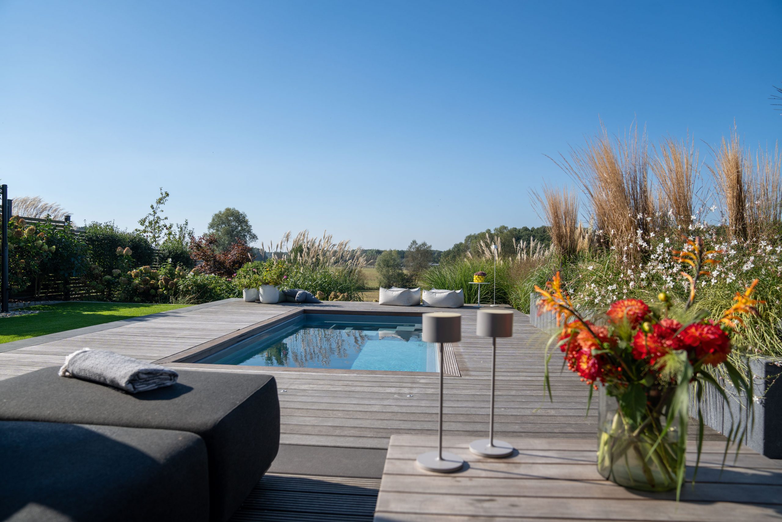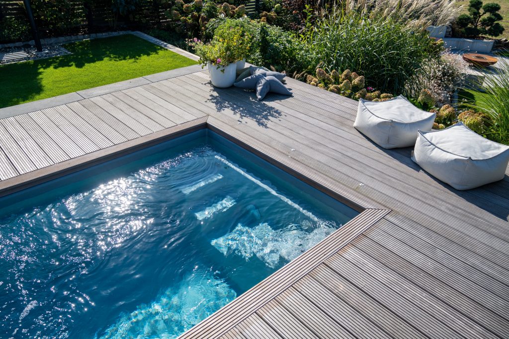 At the center is the CSIDE mini pool from RivieraPool in the lounge pool version, measuring 2.1 meters in width and 4.7 meters in length. The design is visually framed by a wide wooden terrace, creating a harmonious yet distinctive focal point. A staircase along one side provides comfortable access to the water. On both sides, steps with gently flowing surfaces lead down into the pool and merge at the lowest level.