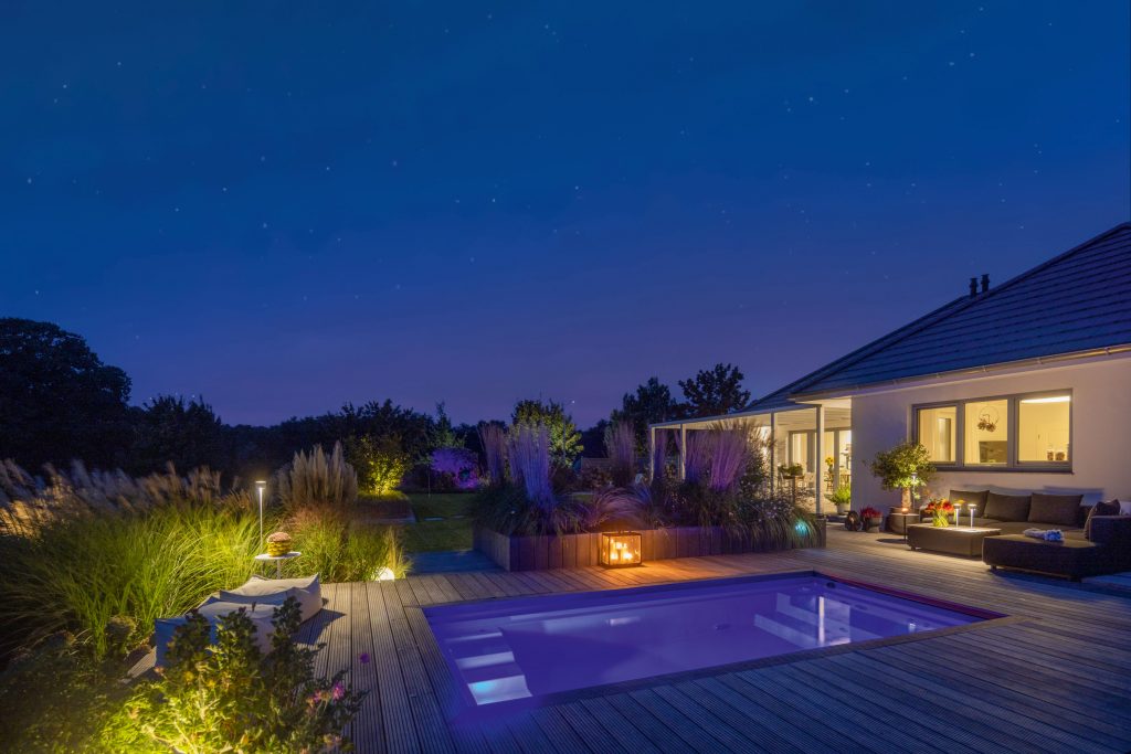 These massage jets are controlled via a spa-touch display, which also manages the pool control system. An electric heater ensures comfortable water temperatures. The lighting concept includes powerful, DMX-capable LED underwater spotlights that bathe the mini pool in atmospheric colored light during the evening.