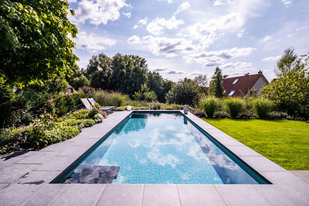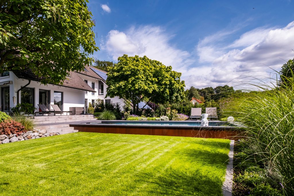 From the generous terraces and lounge areas surrounding the house, several steps lead down to the pool deck, and further levels open up towards the expansive lawn. This structured, terraced design gives the entire garden a harmonious character and a clear, organized layout.