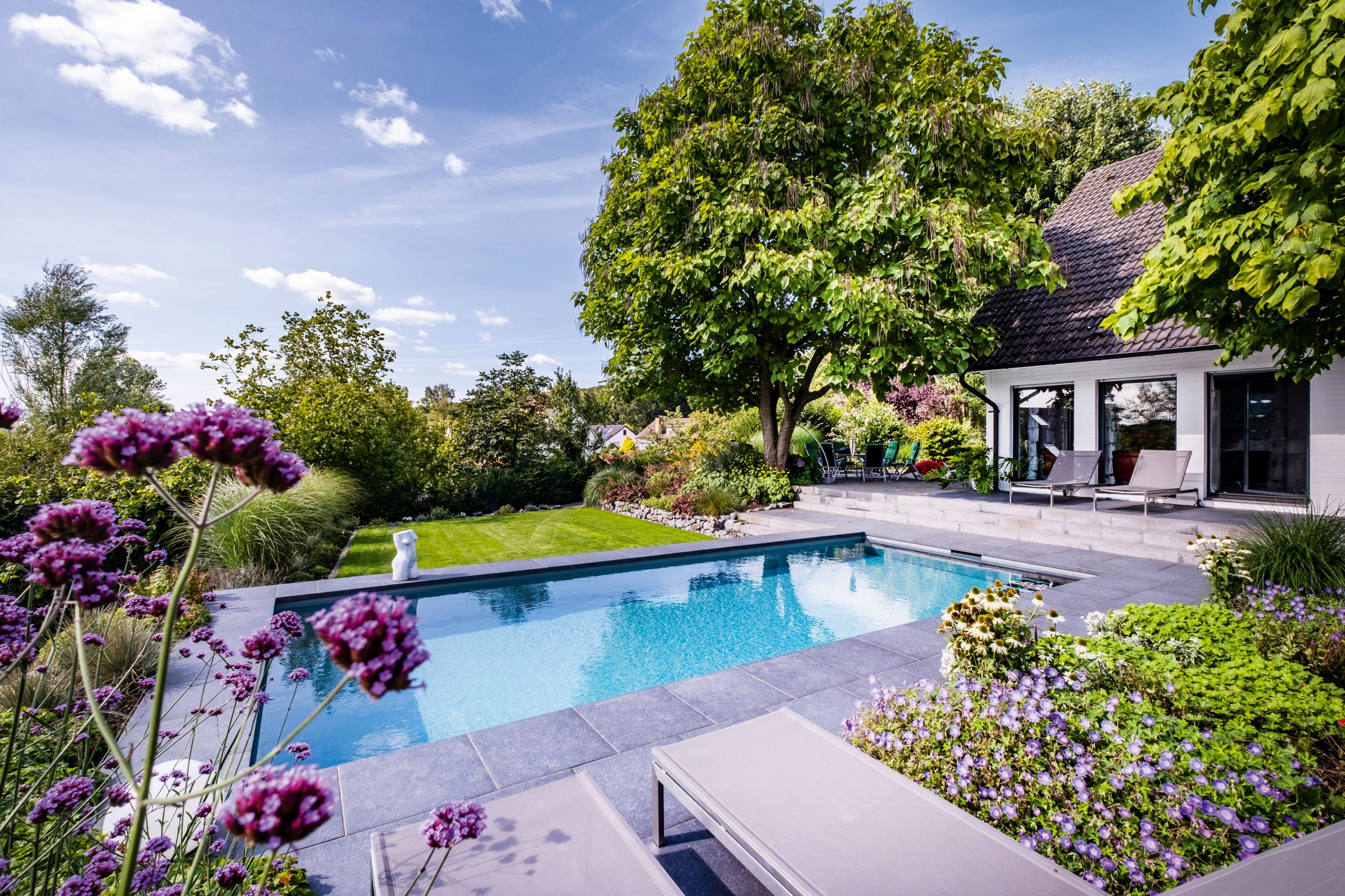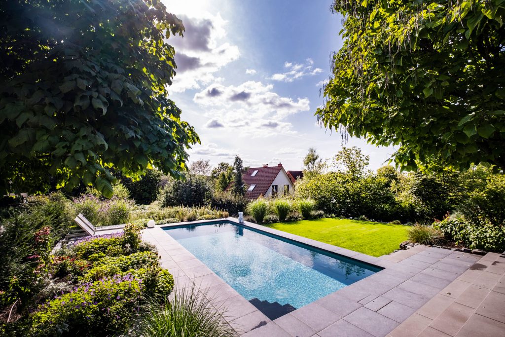 On a sloping property near Osnabrück, nestled in the Teutoburg Forest, Pools & Ponds created a spacious bathing and residential garden.