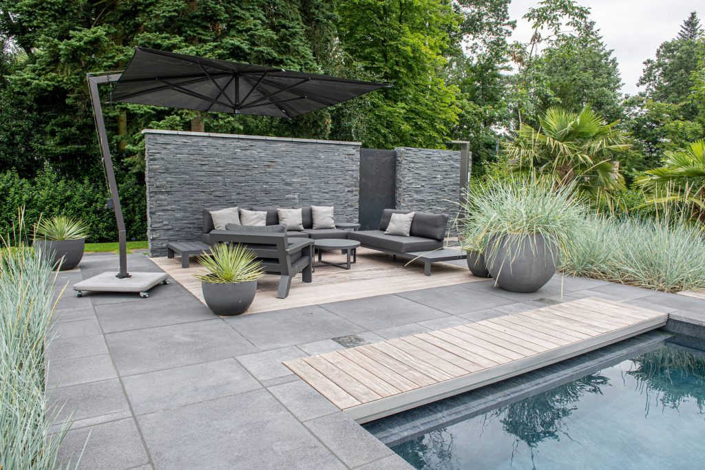 For the swimming pool, one half of the garden was raised by two steps, creating interesting opportunities for planting along the sides—so that the soil itself is not visible from above. The pool platform extends as a wide band of dark grey stone slabs all the way to the back of the garden, where a decorative wall in a slate look with an integrated glass panel provides wind protection. Only in the area of the cushioned lounge and along one side with sun loungers are the stone surfaces softened by warm wooden deck elements.