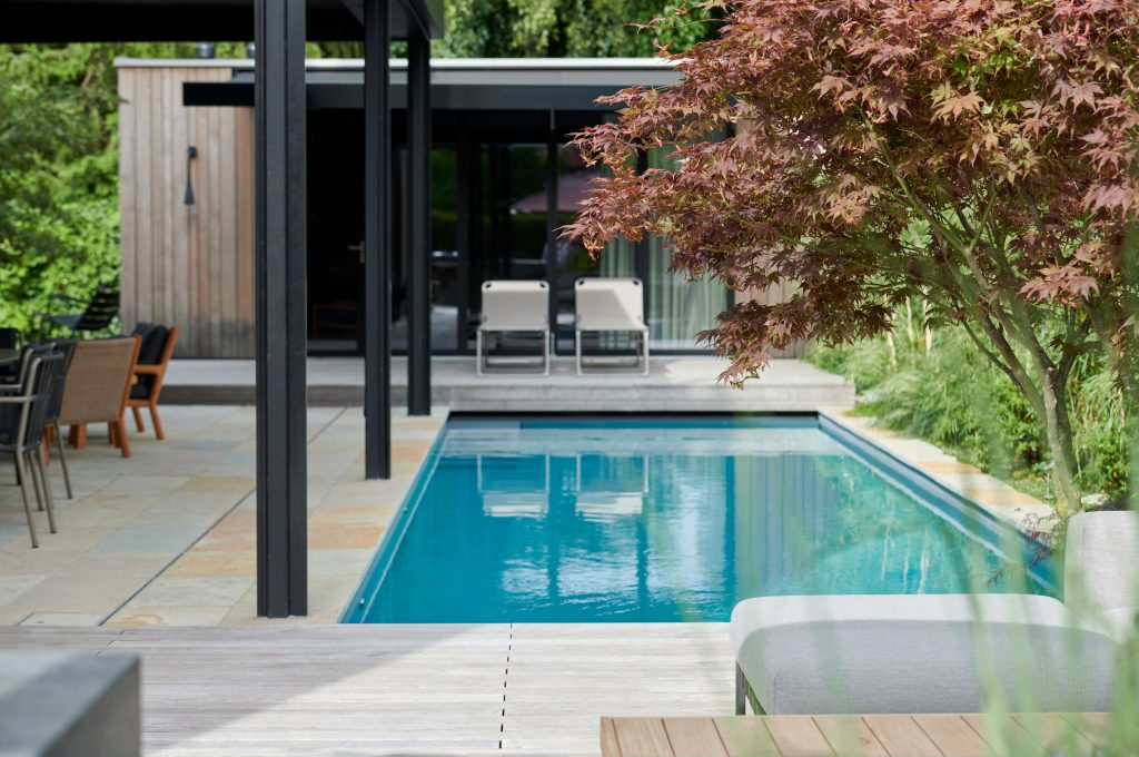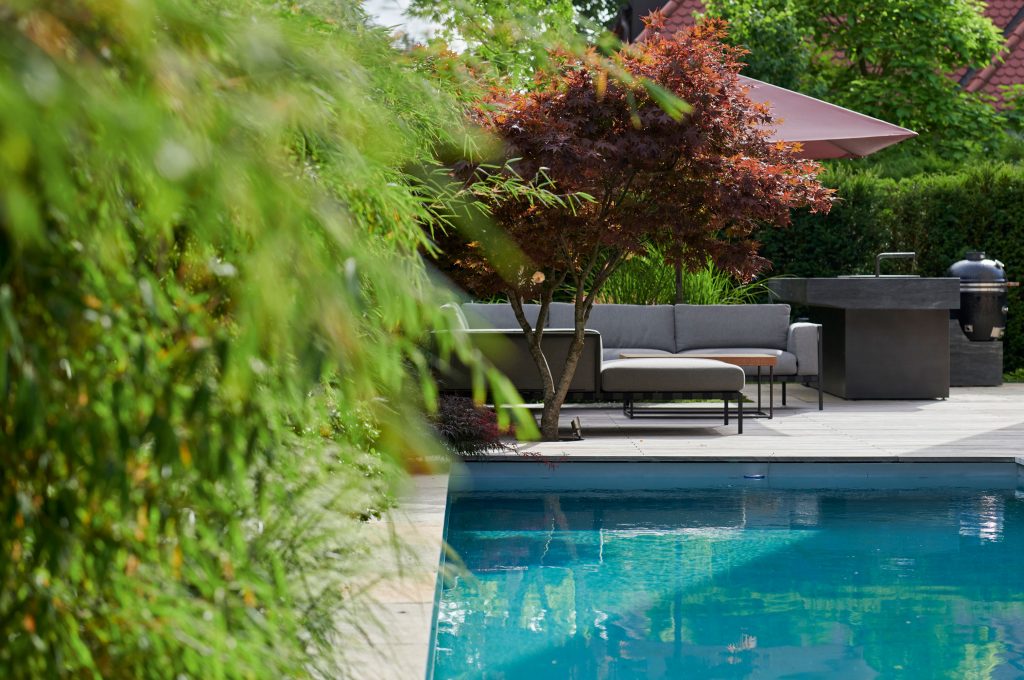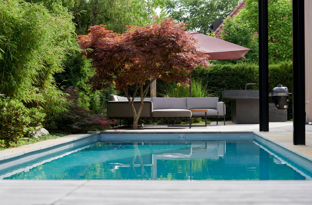 The garden pool, with its biological water treatment system, is surrounded by specimen trees, lush perennials, and shrubs that create a cozy atmosphere—both while swimming and when relaxing in the lounge area.