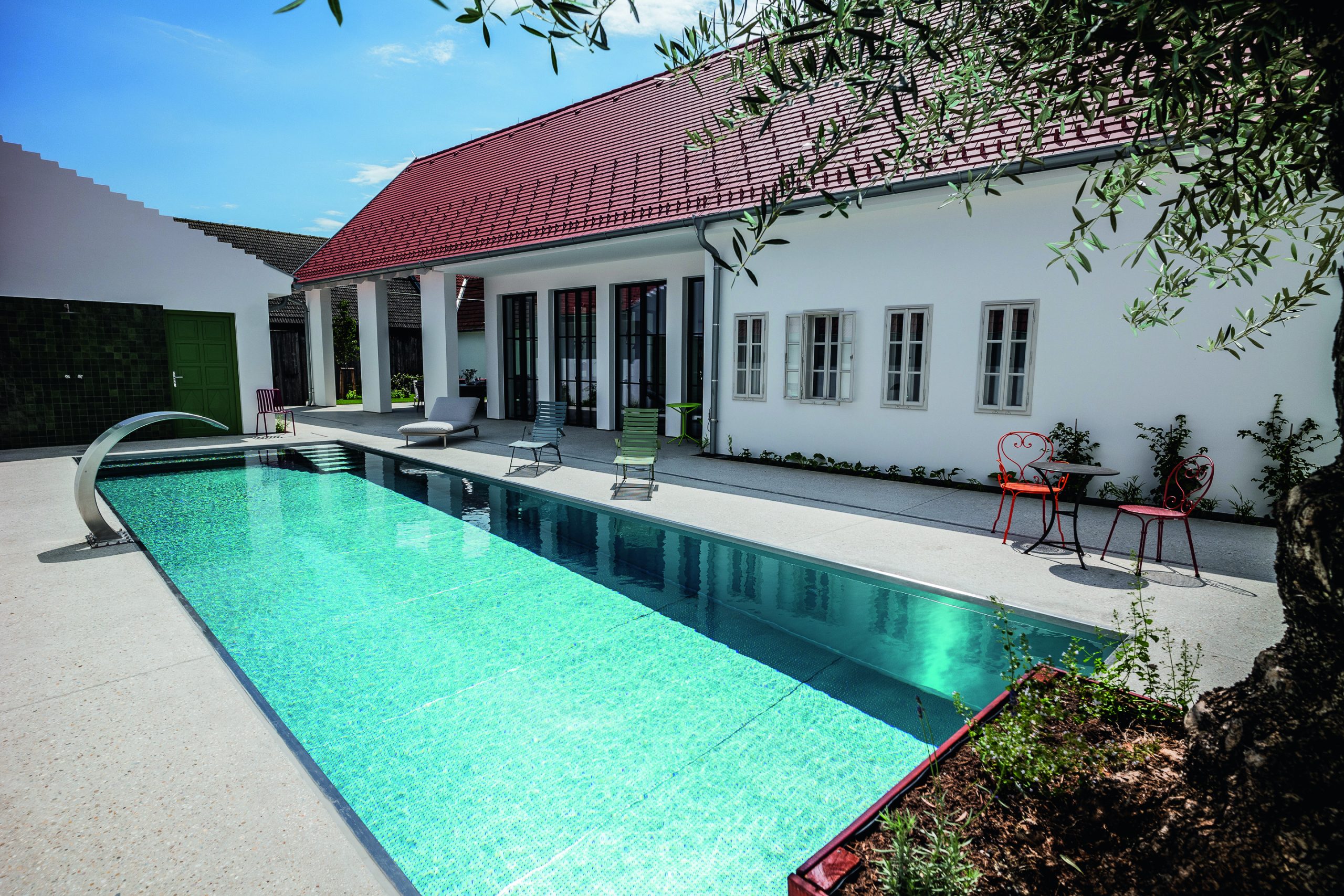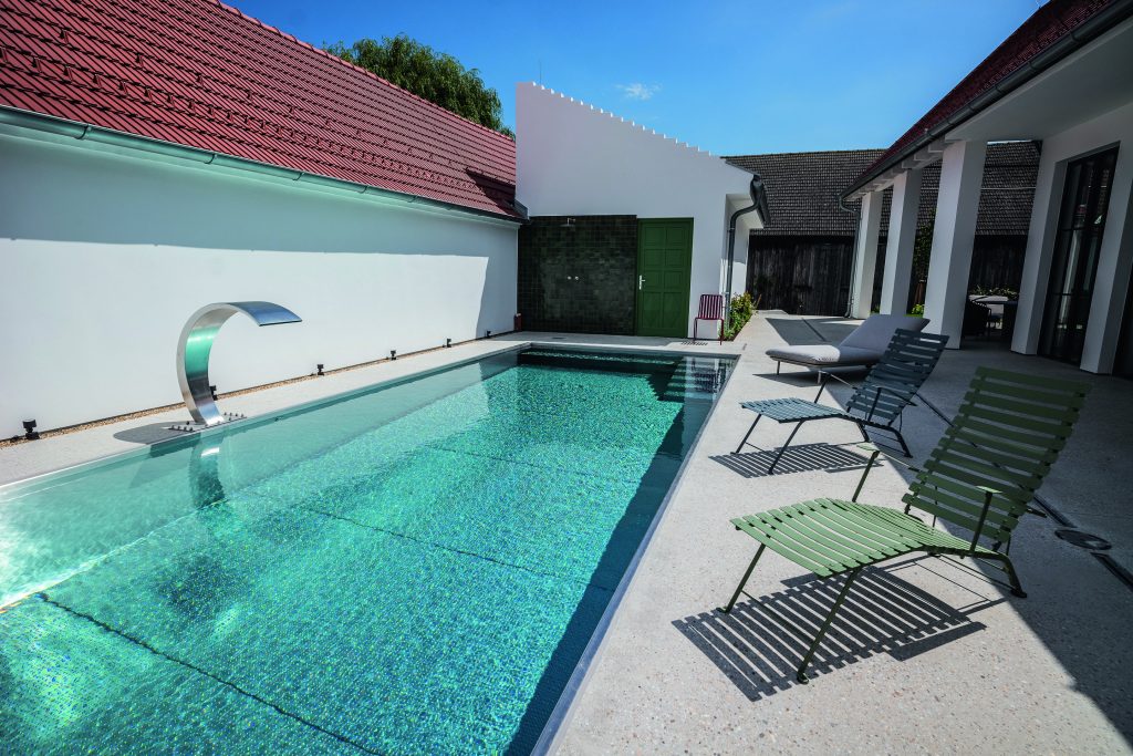 In Göttlesbrunn in Lower Austria, AQA Steel realized a stainless steel pool in the spacious patio of a winemaking family, where work and living seamlessly blend together. The 12 × 3.5 meter pool is sheltered from the wind between the surrounding buildings and, on warm days, benefits from a Mediterranean-like atmosphere. This feeling is further enhanced by the design of the pool surroundings, at the center of which stands a striking old olive tree serving as a natural focal point.