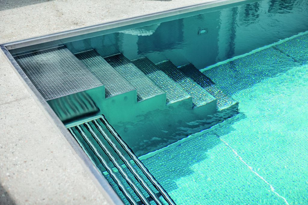 A staircase entry leads into the pool from the side. Like the pool floor, the steps are made of textured stainless steel to provide better grip. Directly beside it, a tubular bench with an integrated air bubble function adjoins.