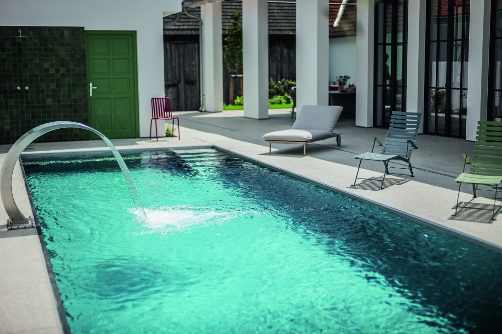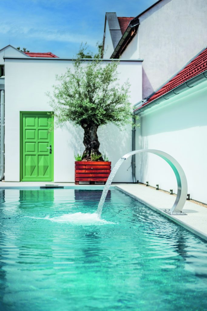 Water treatment is fully automatic, and the pool water is also heated. A roller cover is invisibly integrated into a “backpack” housing attached to the pool structure. An elegantly curved waterfall feature at the pool edge completes the equipment. In the evening, the white wall behind the pool is beautifully highlighted by façade lighting.