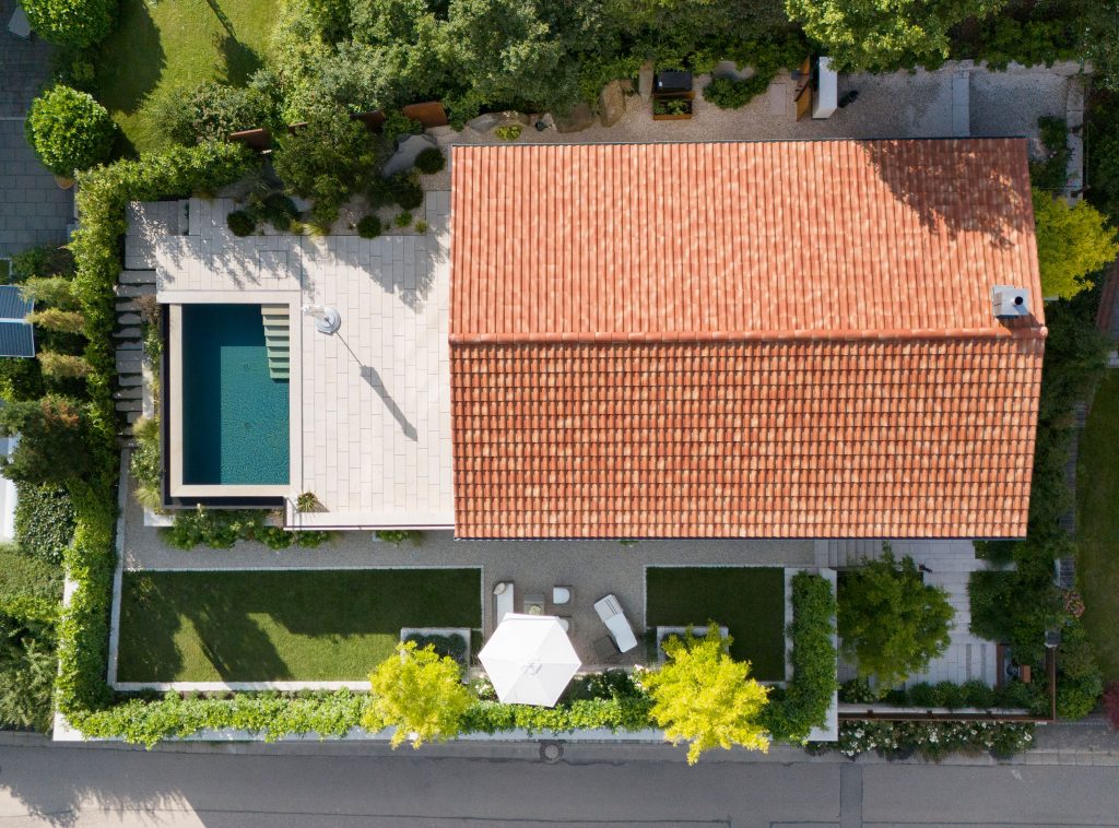 The garden of this home in Upper Bavaria spans three levels and was completely redesigned by Die Königsgütler. The different height levels resulted from the steep slope of the property. Although they divide the garden into separate areas connected by staircases, they also made it possible to create a breathtaking infinity pool.