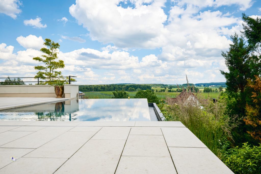 The pool is located at the outer edge of a terrace built with limestone slabs from Dietfurt. The water surface, equipped with a natural pool filtration system, lies just below the terrace paving, while at both corner edges the water appears to flow freely into the air.