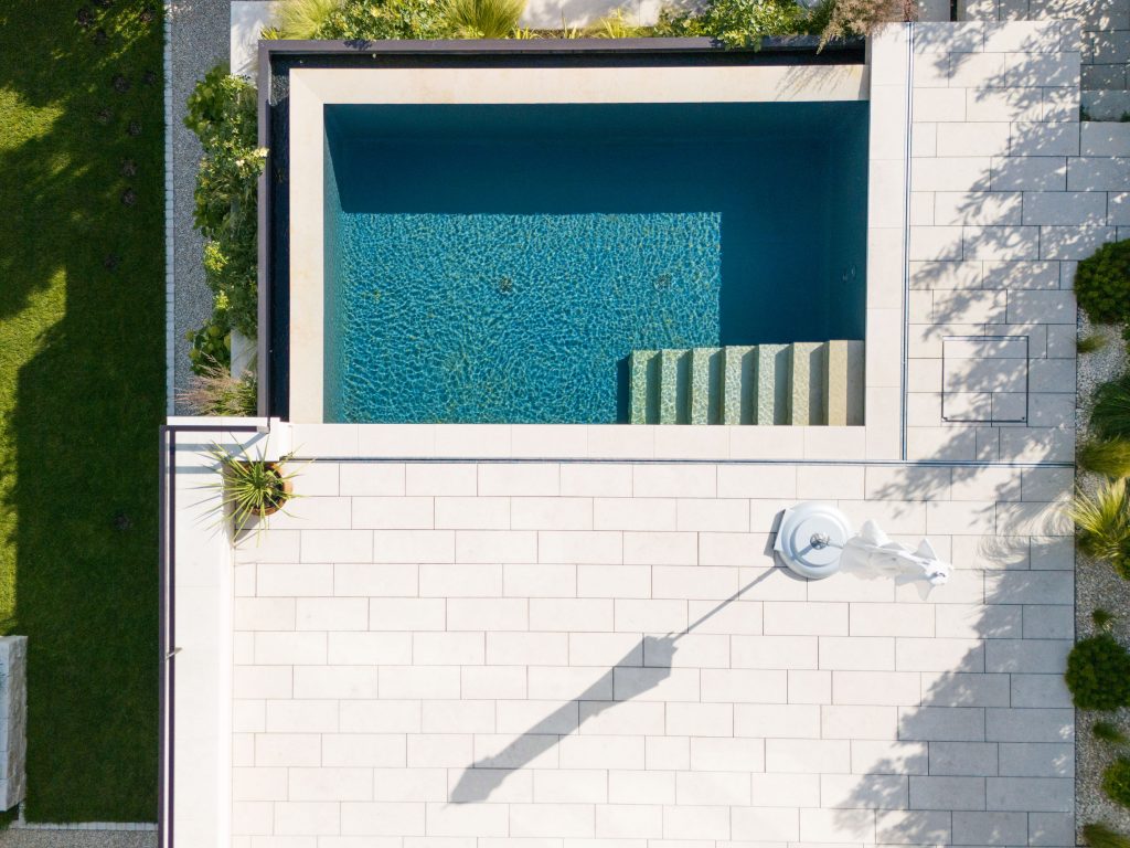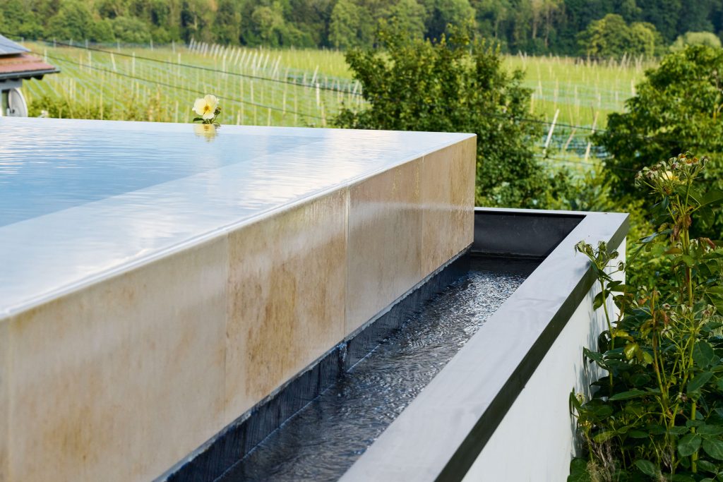 The infinity overflow is located at the outer corner of the pool and, thanks to its elevated position, offers a breathtaking view. The overflow channel is clad with custom-cut natural stone slabs that were pre-bonded at an angle in the factory.